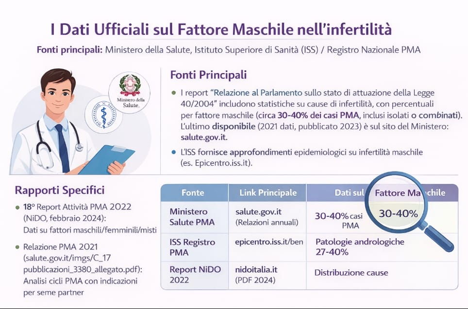 Nell’infografica, i principali dati provenienti dai report pubblicati dall’Istituto Superiore di Sanità, che includono statistiche dettagliate su cause di infertilità, con percentuali per fattore maschile (circa 30-40% dei casi PMA, inclusi isolati o combinati).